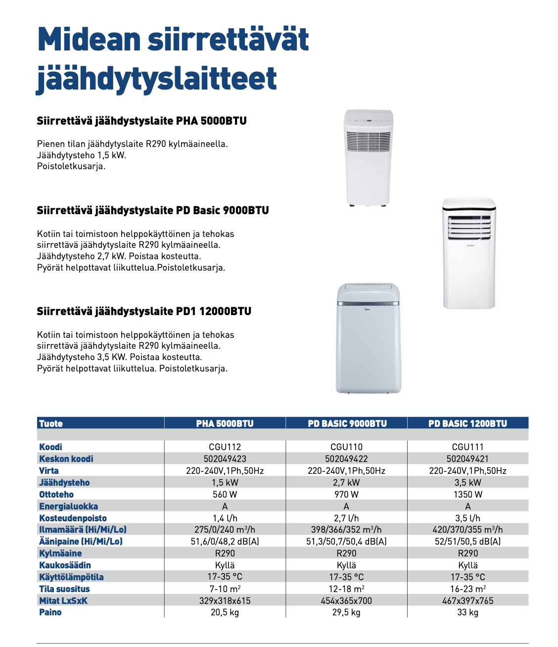 Midea siirrettävä jäähdytyslaite on mukava viilentäjä kesän helteille. Midea jäähdytyslaitteen jäähdytysteho on 3,5 kW. Soveltuu n. 12 – 18m2 kokoisen tilan jäähdyttämiseen.